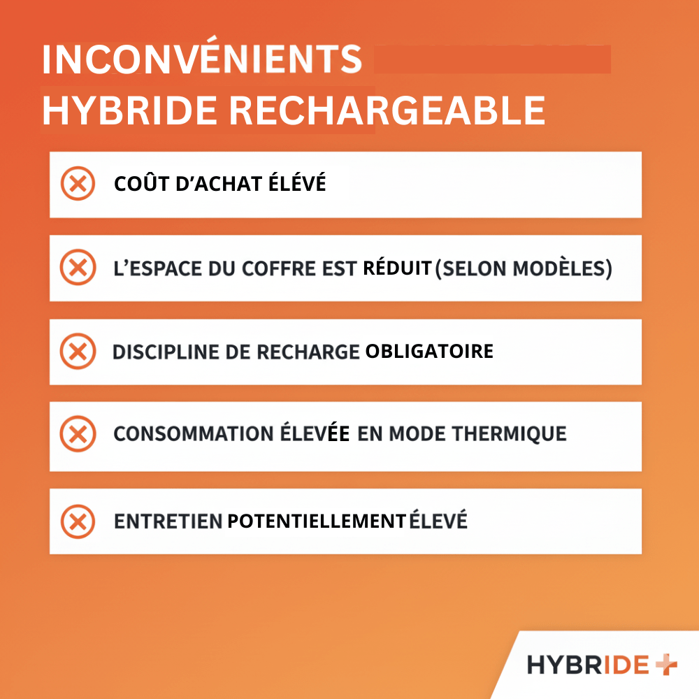 Un vrai mode électrique avec plusieurs dizaines de km sans essence. Un coût d’achat plus élevé qu’une voiture thermique classique.