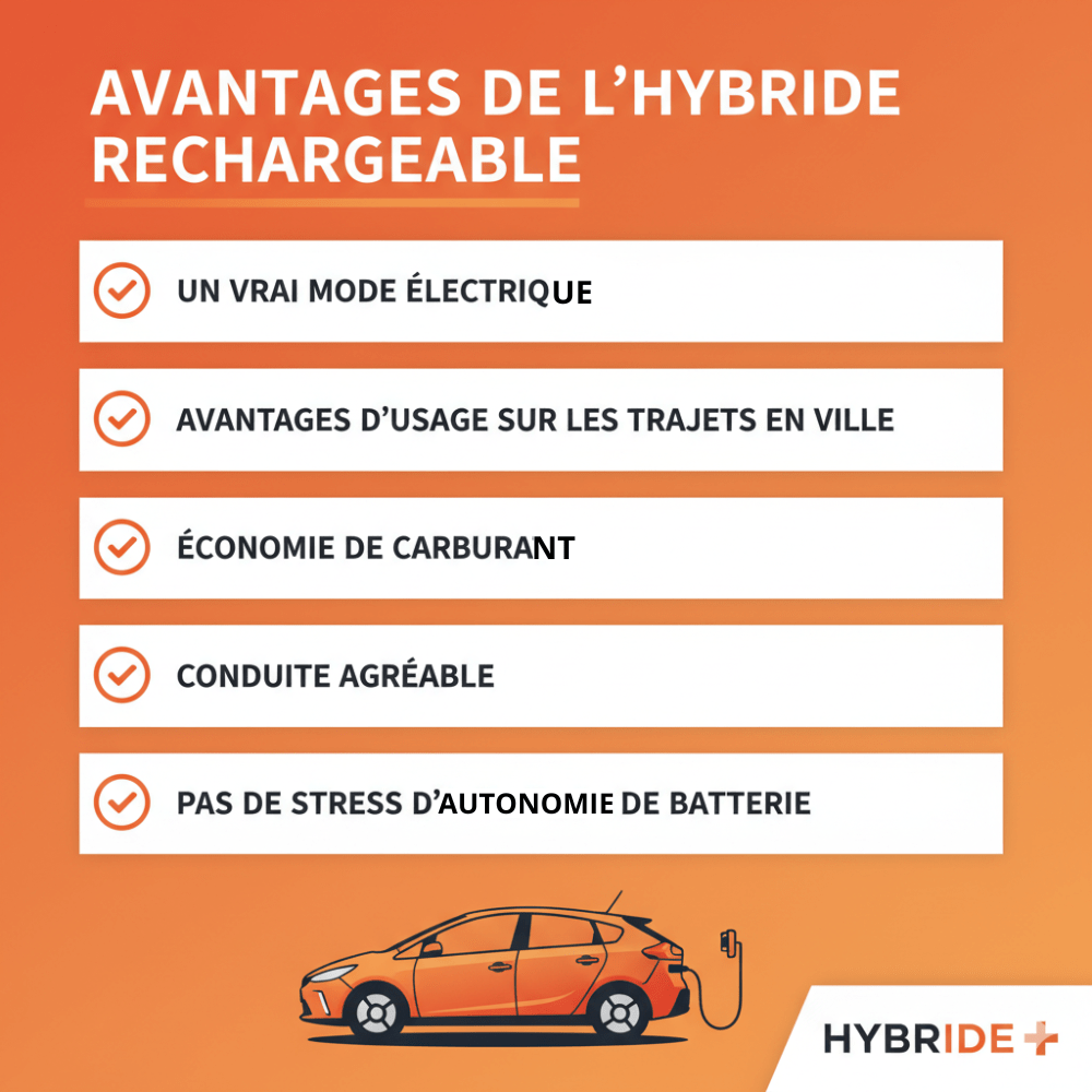 Une voiture hybride rechargeable permet de rouler en mode électrique pour vos trajets quotidiens, tout en gardant un moteur thermique pour les longues distances. Résultat : pas de stress lié à l’autonomie, pas de peur de finir planté sur la bande d’arrêt d’urgence avec une batterie vide.