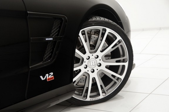 Côté préparation extérieure, Brabus utilise à foison la fibre de carbone. Le capot reçoit une importante prise d’air en fibre de carbone pour refroidir le gros V12, des prises d’air latérales plus importantes viennent s’ajouter à cette liste de modifications en plus du nouveau système d’échappement à doubles sorties (2×2).  Si les sorties d’échappement sont trop bruyantes à votre gout, un système nommée « Coming Home » pourra résoudre ce léger désagrément. Les jantes en 19’’ sont mises de côté pour de nouvelles jantes en 20’’ (255/30 à l’avant et 305/35 à l’arrière). En quête d’aérodynamisme, la Brabus Roadster 800 utilise des suspensions ABC abaissant la caisse d’environ 25 millimètres. Le client aura tout de même le choix entre une monte Continental, Pirelli ou Yokohama.