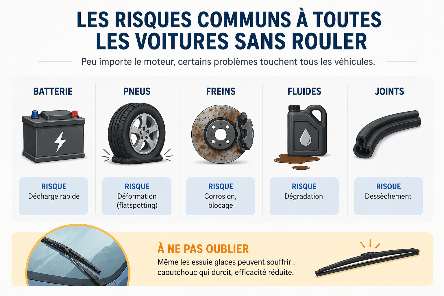 Même les essuie glaces peuvent souffrir : caoutchouc qui durcit, efficacité réduite.