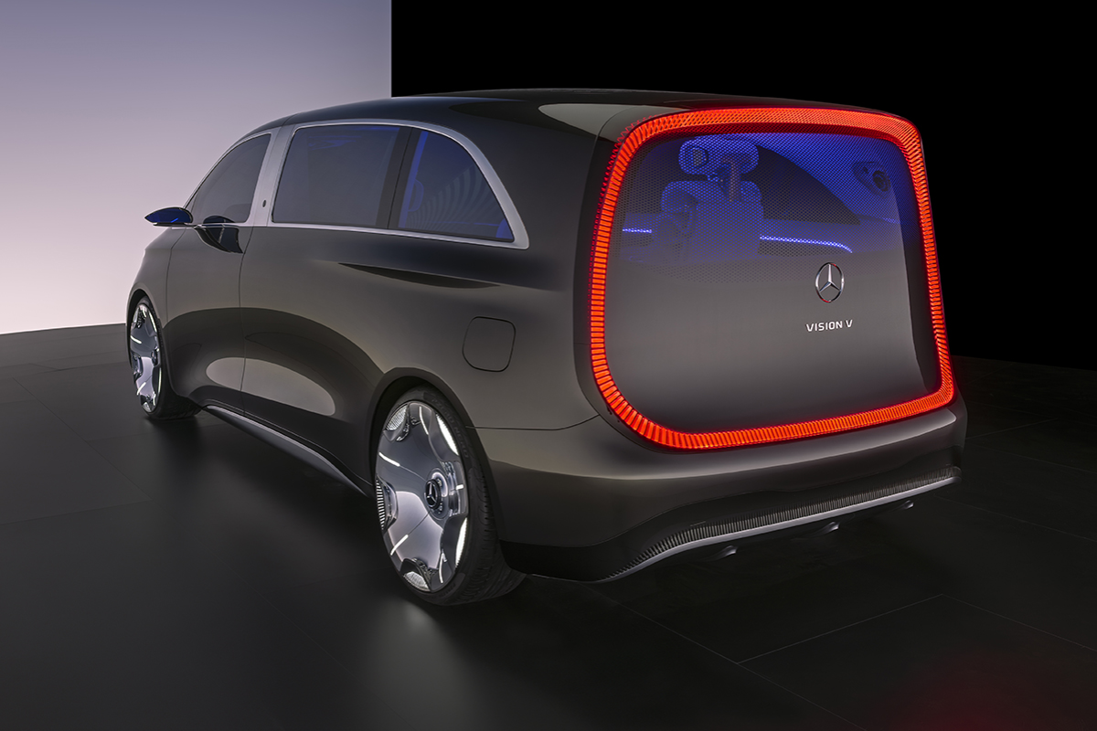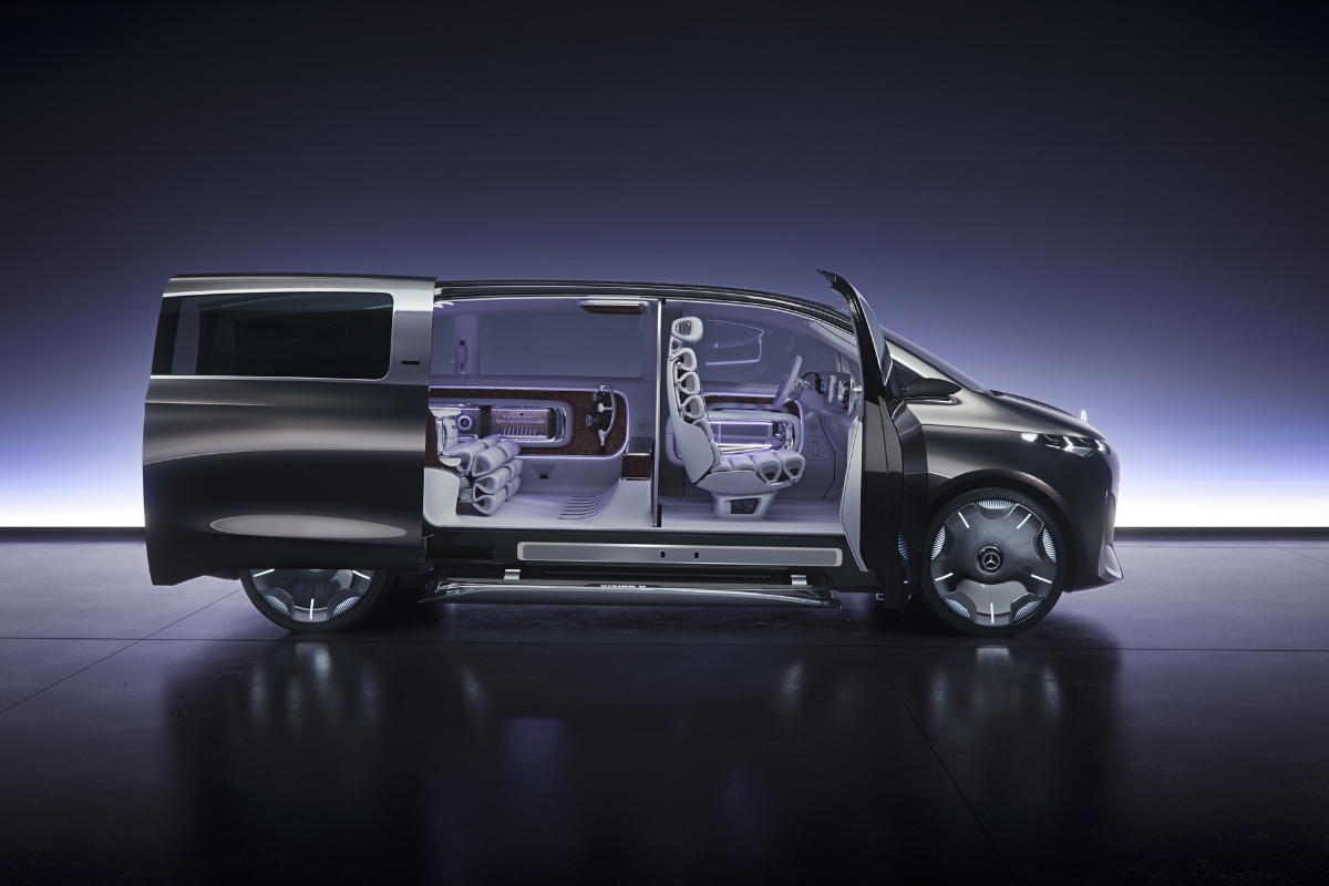 À l’intérieur, Mercedes veut faire oublier qu’on est dans un utilitaire. On parle d’un aménagement premium, d’un espace optimisé, de matériaux haut de gamme, d’écrans multiples, et d’un cloisonnement possible entre la cabine avant et l’espace passager. Le prototype Vision V préfigure certains de ces choix, avec notamment un écran de 65 pouces rétractable et des vitrages à opacité variable.