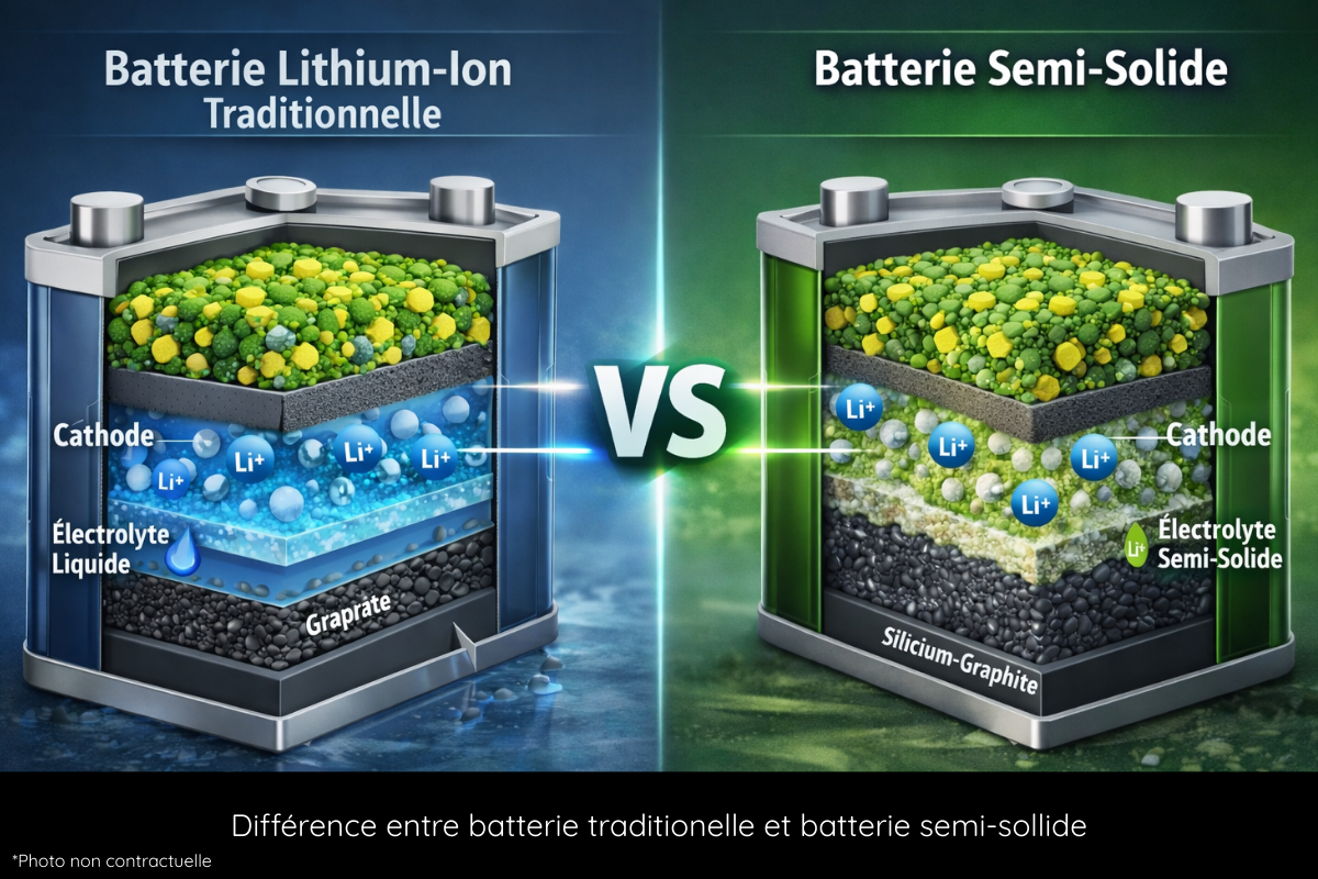 Illustration de la technologie de batterie semi-solide, comparée à une batterie lithium-ion traditionnelle