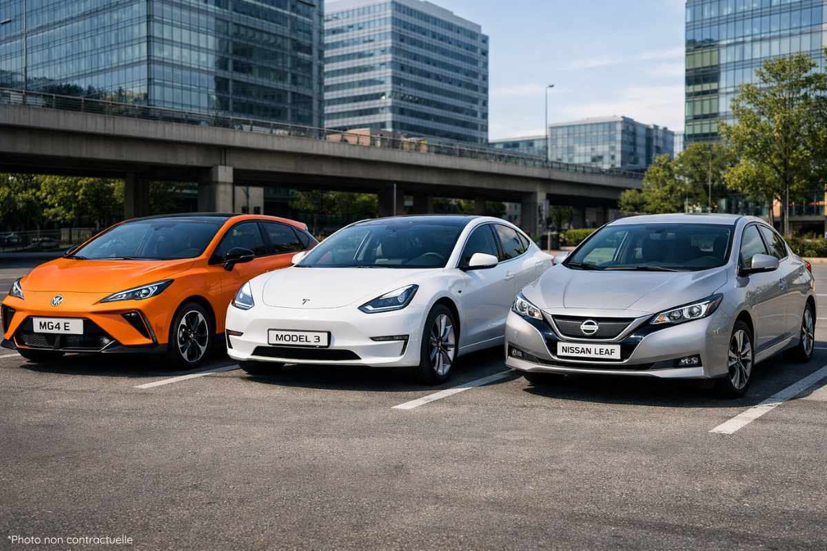 Comparaison visuelle entre MG4, Tesla Model 3 et Nissan Leaf sur un parking